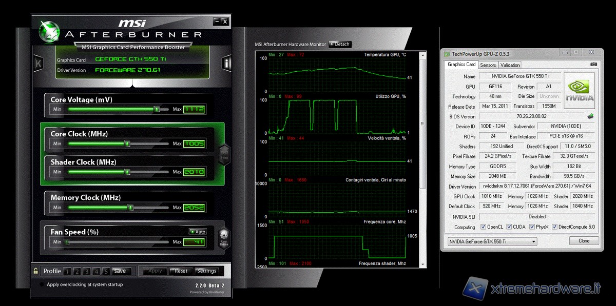 Analizziamo adesso come si comporta in overclock questa scheda. A tal proposito come potete vedere dalle immagini abbiamo usato un software apposito che ci permette di agire su diversi parametri. Il core grafico senza toccare il voltaggio della gpu ha permesso di raggiungere una frequenza di 1005 MHz. Come possibile vedere dallo screen in realtà GPU-z ci segnala ben 1010 MHz.